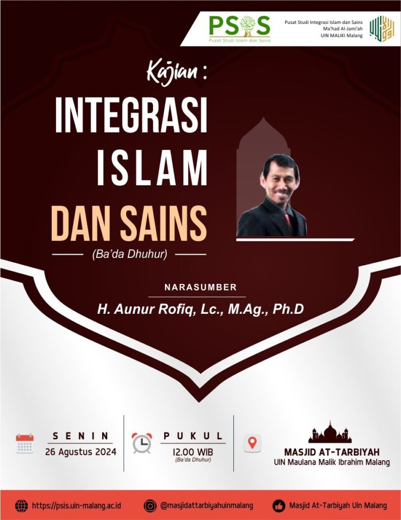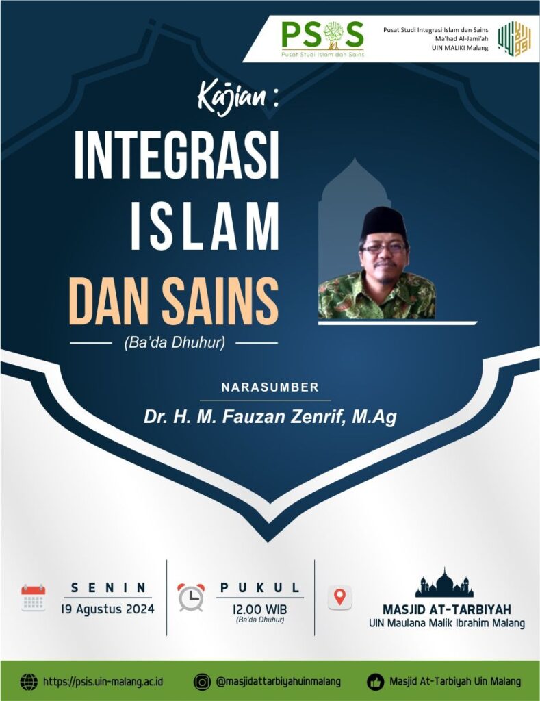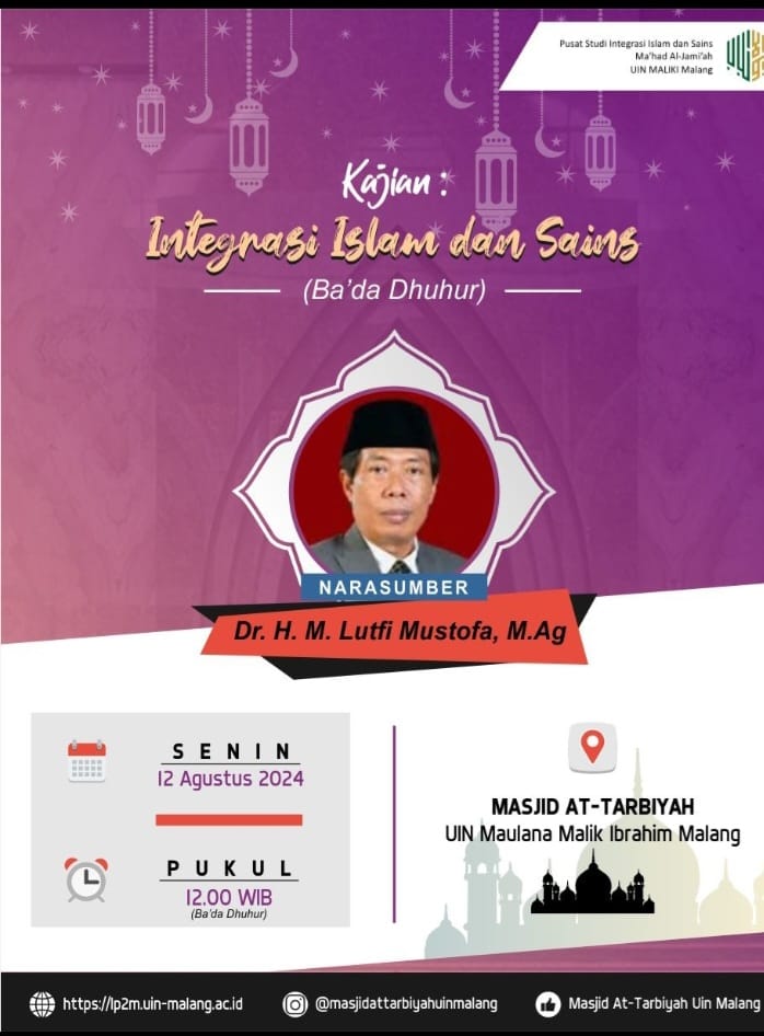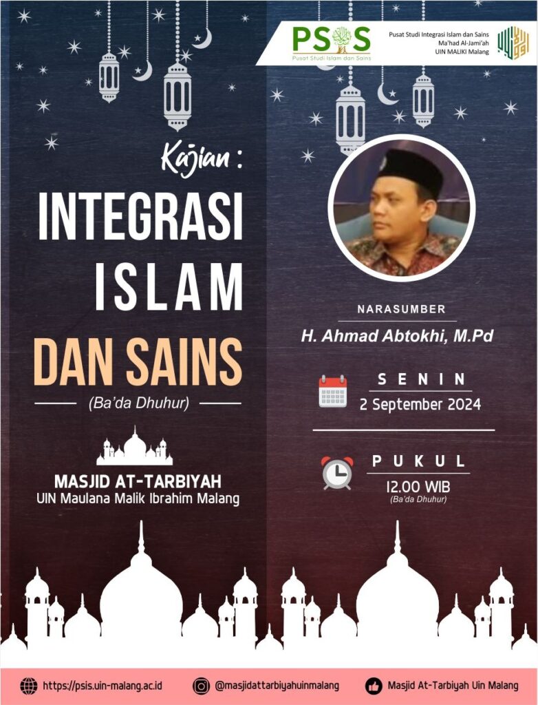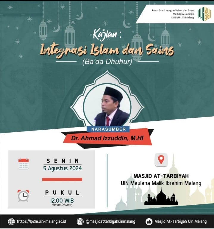 Kegiatan kajian integrasi Islam dan sains dilaksanakan secara rutin (Senin-Kamis) ba’da dhuhur di masjid At-Tarbiyah UIN Maulana Malik Ibrahim Malang