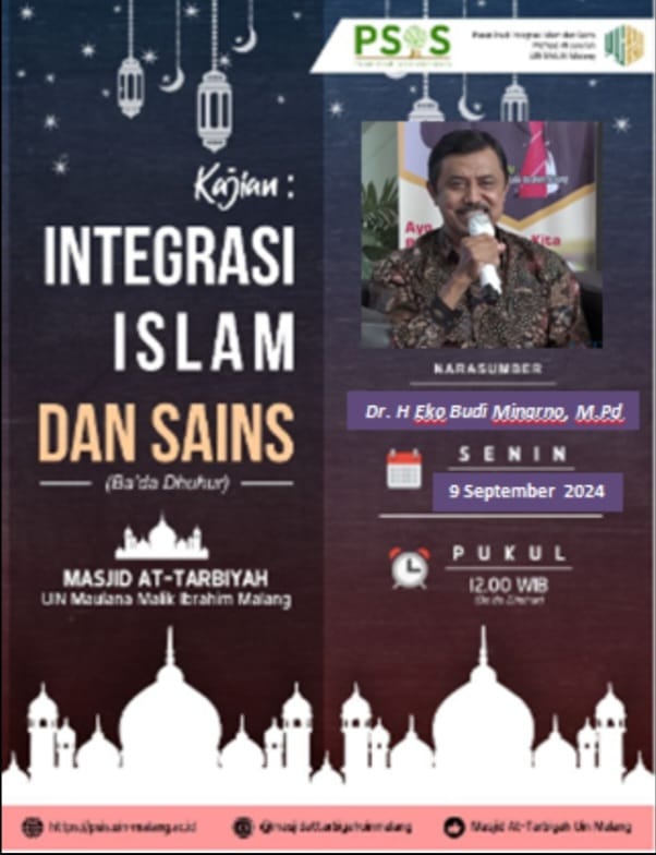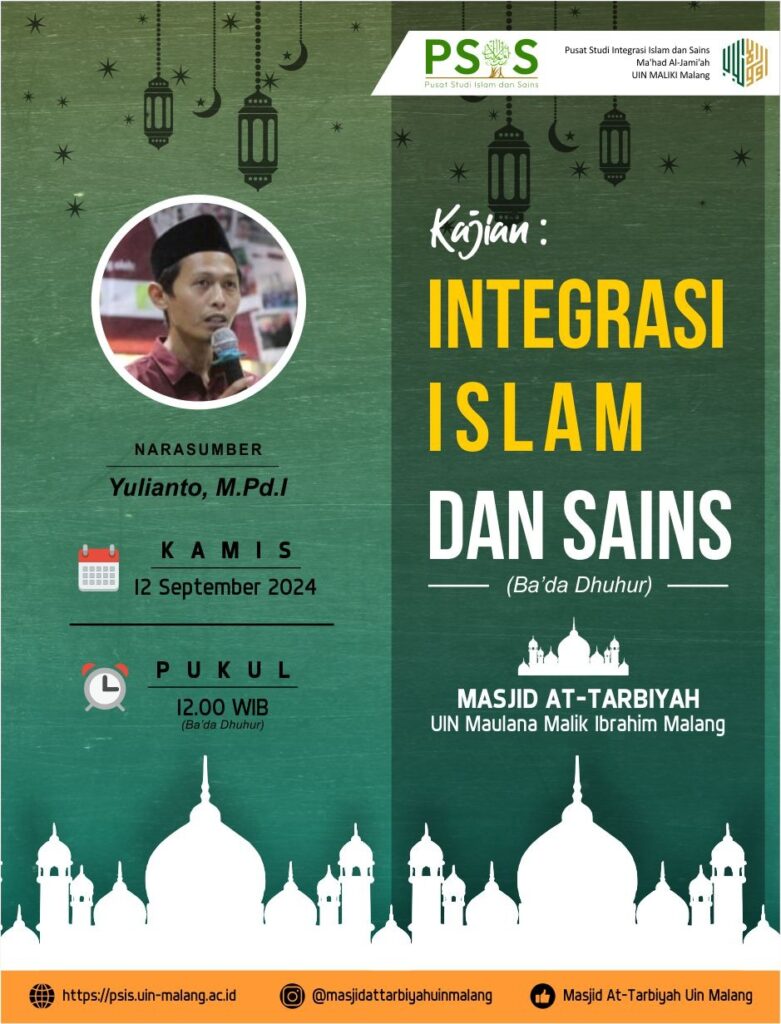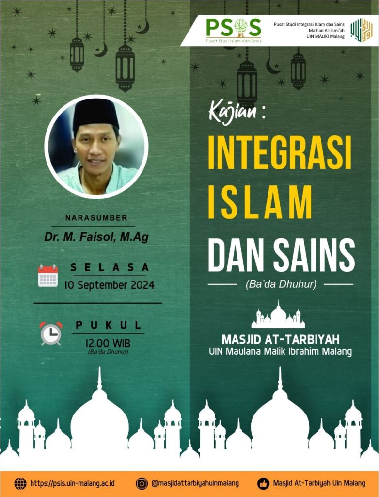 Bpk/Ibu, Monggo untuk hadir sholat dhuhur berjama’ah dan menyimak kajian Integrasi Islam dan Sains di Masjid At-Tarbiyah setiap hari senin sampai kamis.