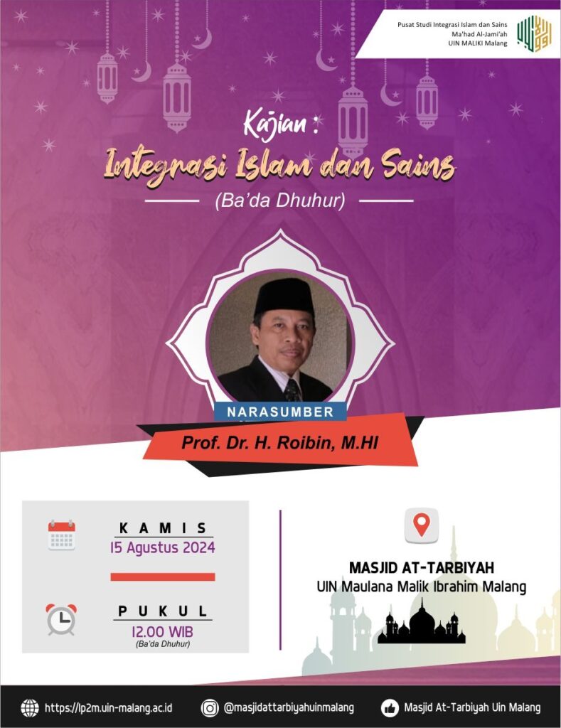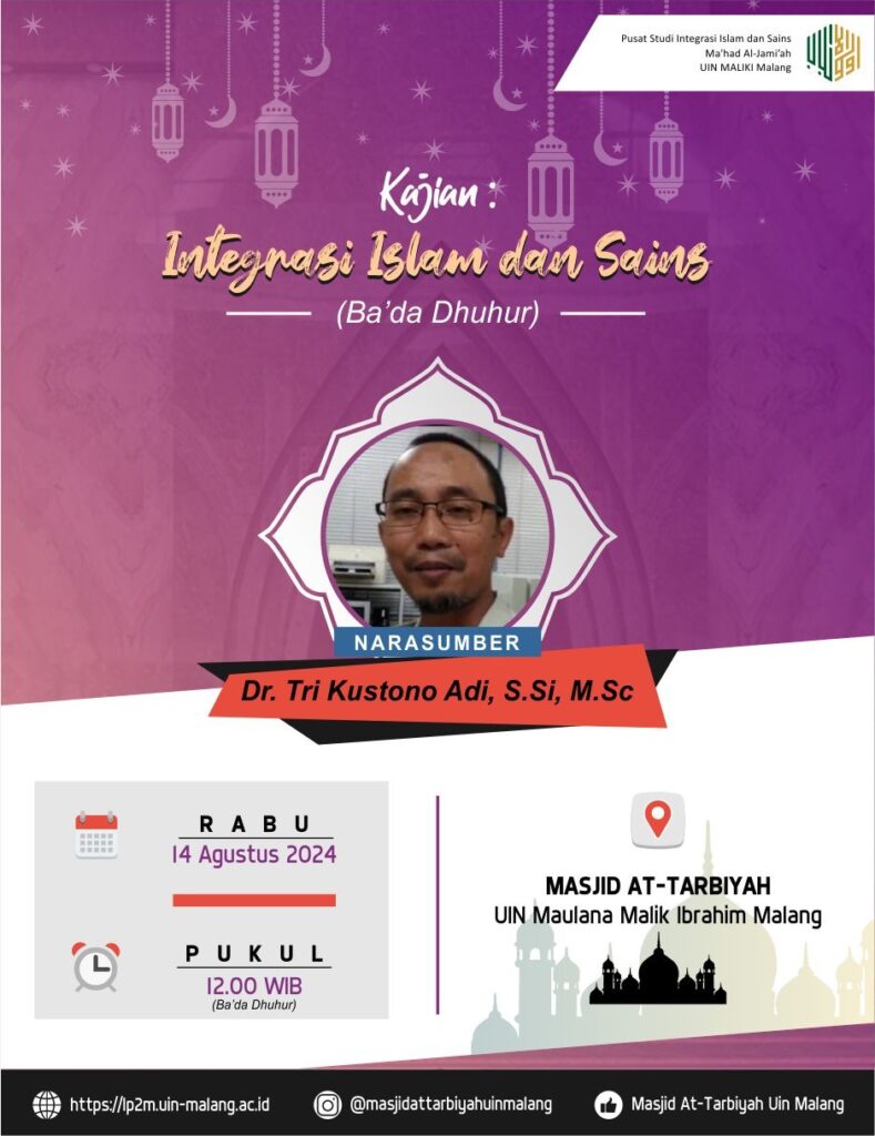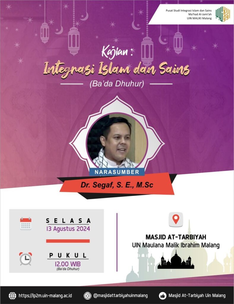 Bpk/Ibu, Monggo untuk hadir sholat dhuhur berjama’ah dan menyimak kajian Integrasi Islam dan Sains di Masjid At-Tarbiyah setiap hari senin sampai kamis.